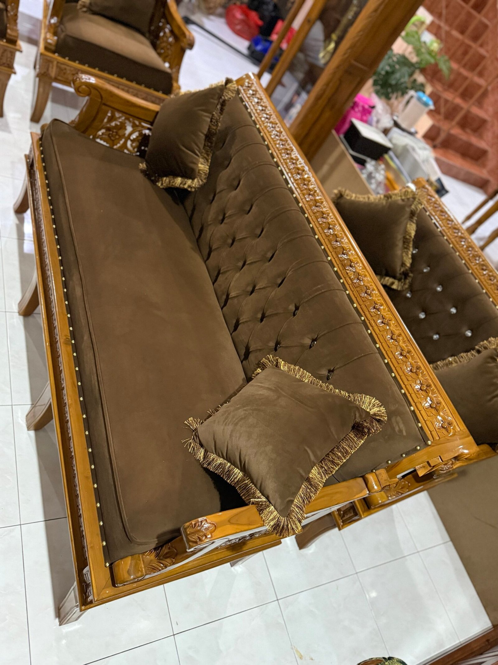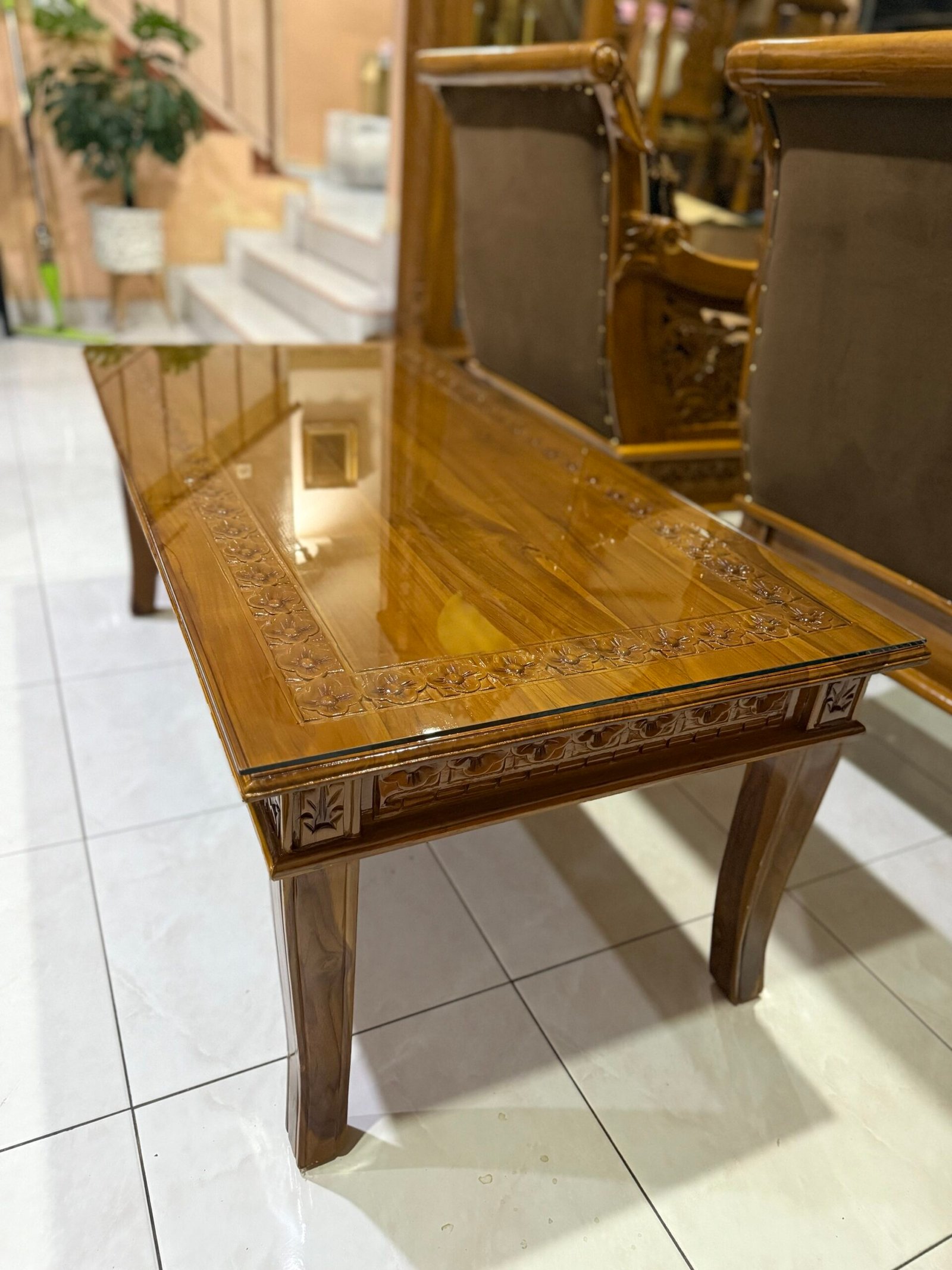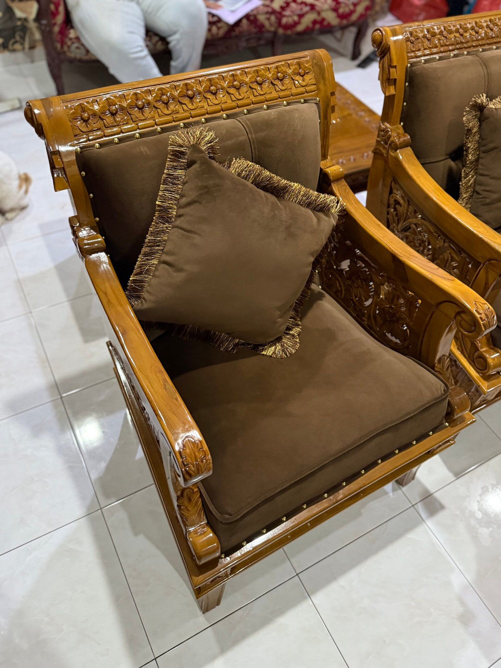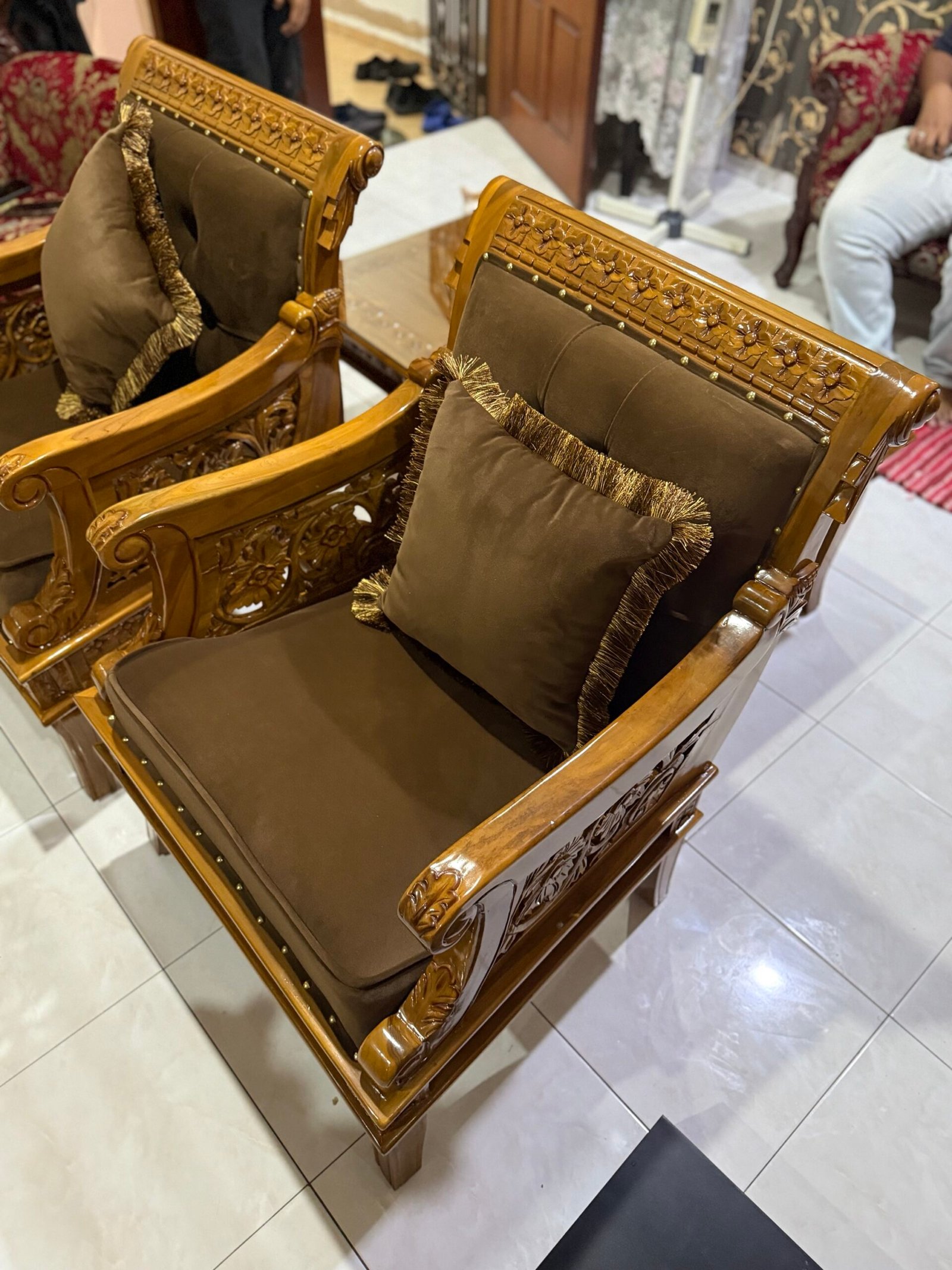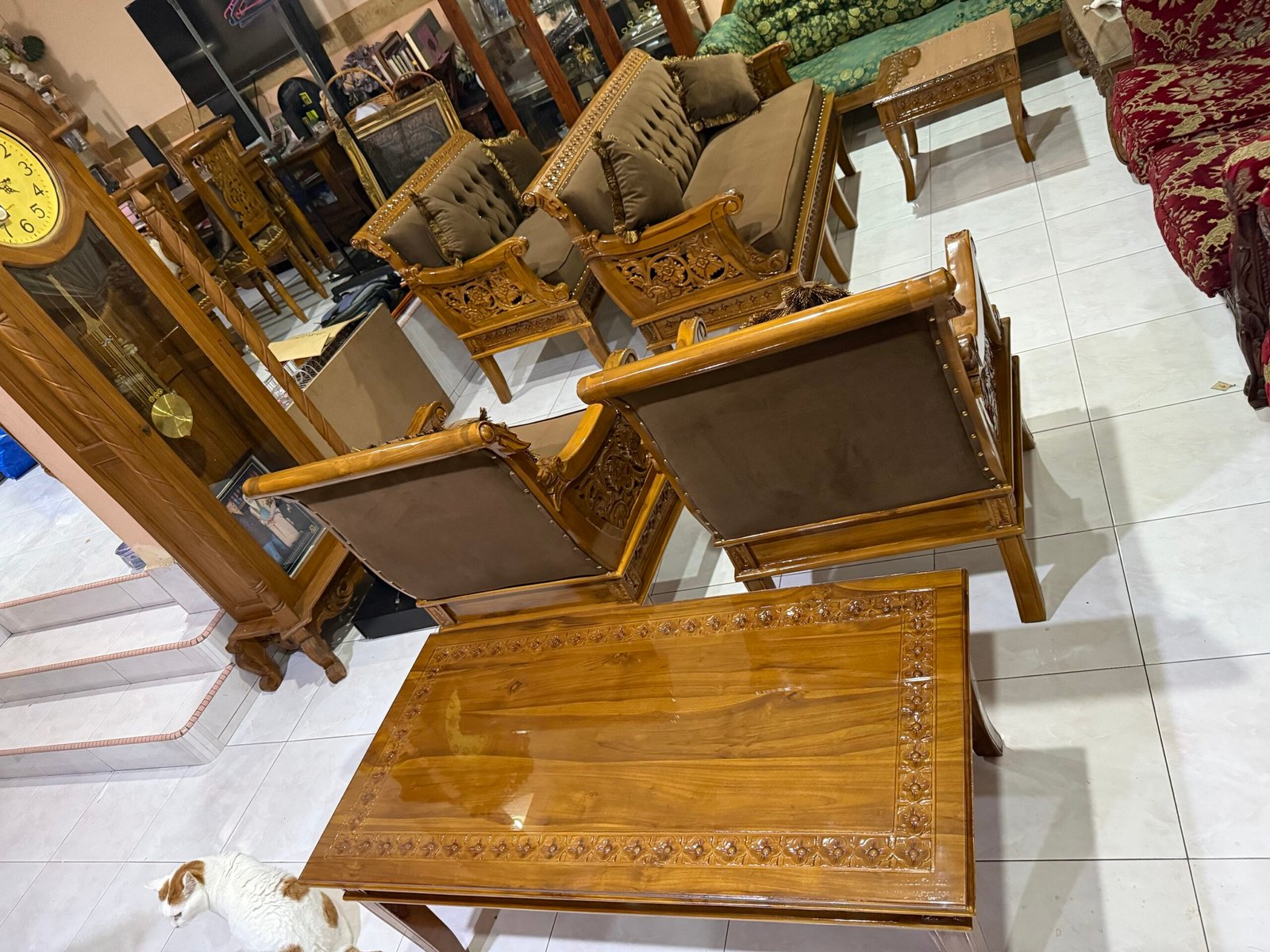 Set mewah yang jadi pilihan ramai acik-acik yang nak ruang tamu nampak gah, megah & elegan. Bukan kayu campur, bukan veneer — 100% kayu jati Gred A, hasil ukiran halus tukang Jepara.